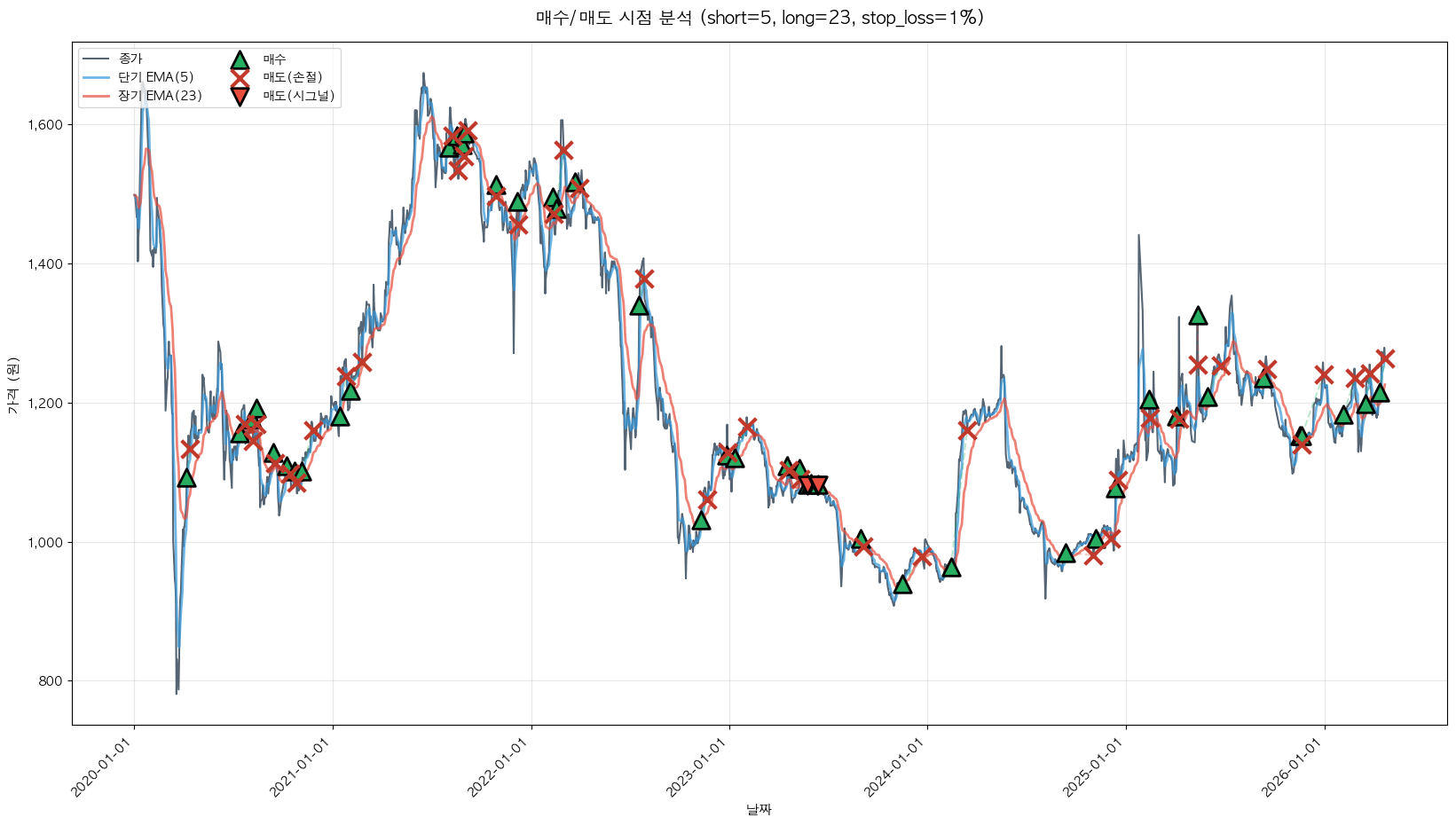 최적 파라미터: 단기=5, 장기=23, 손절=1%