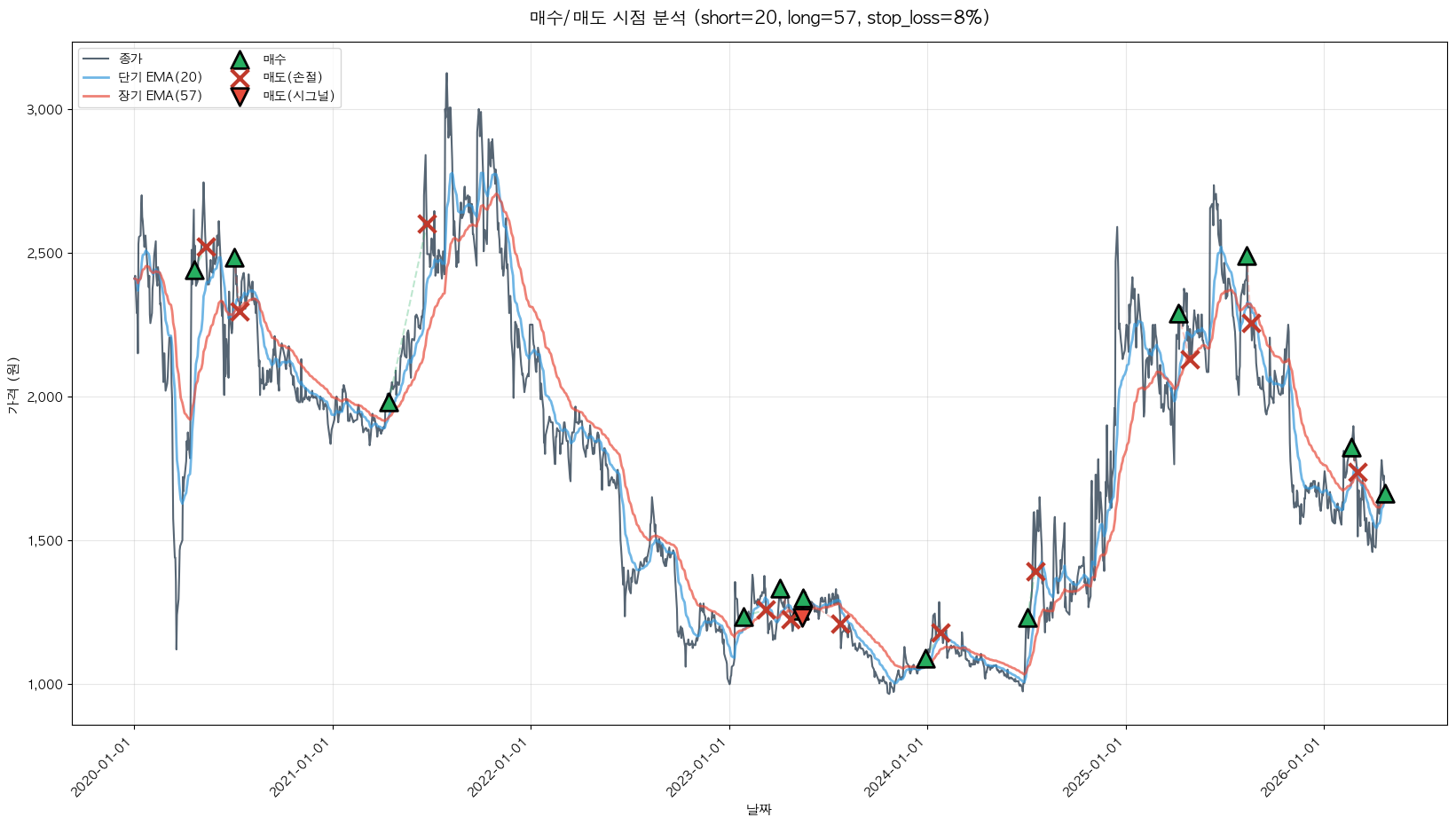백테스팅 중... (short=20, long=57, stop_loss=8%)