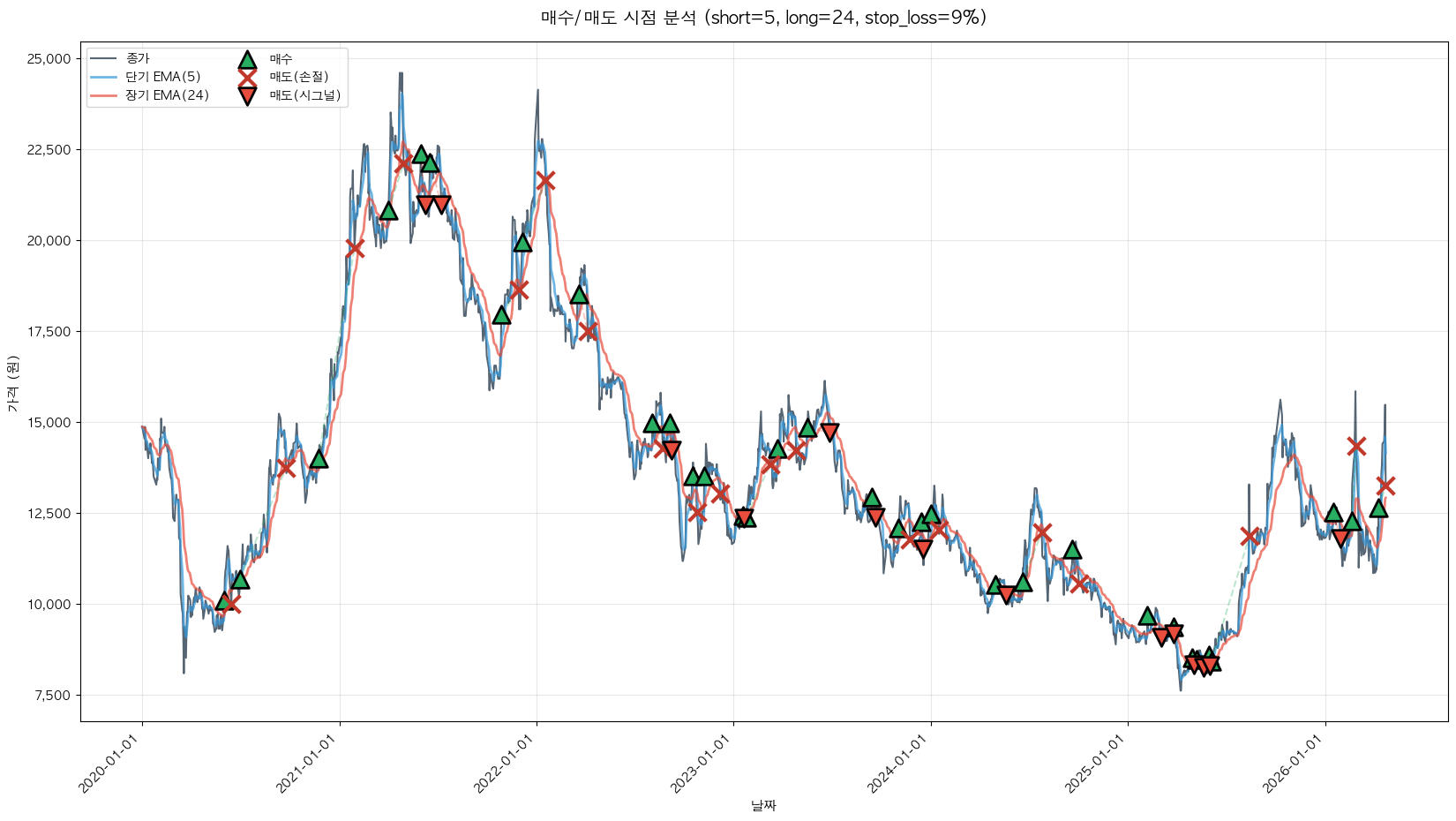 백테스팅 중... (short=5, long=24, stop_loss=9%)