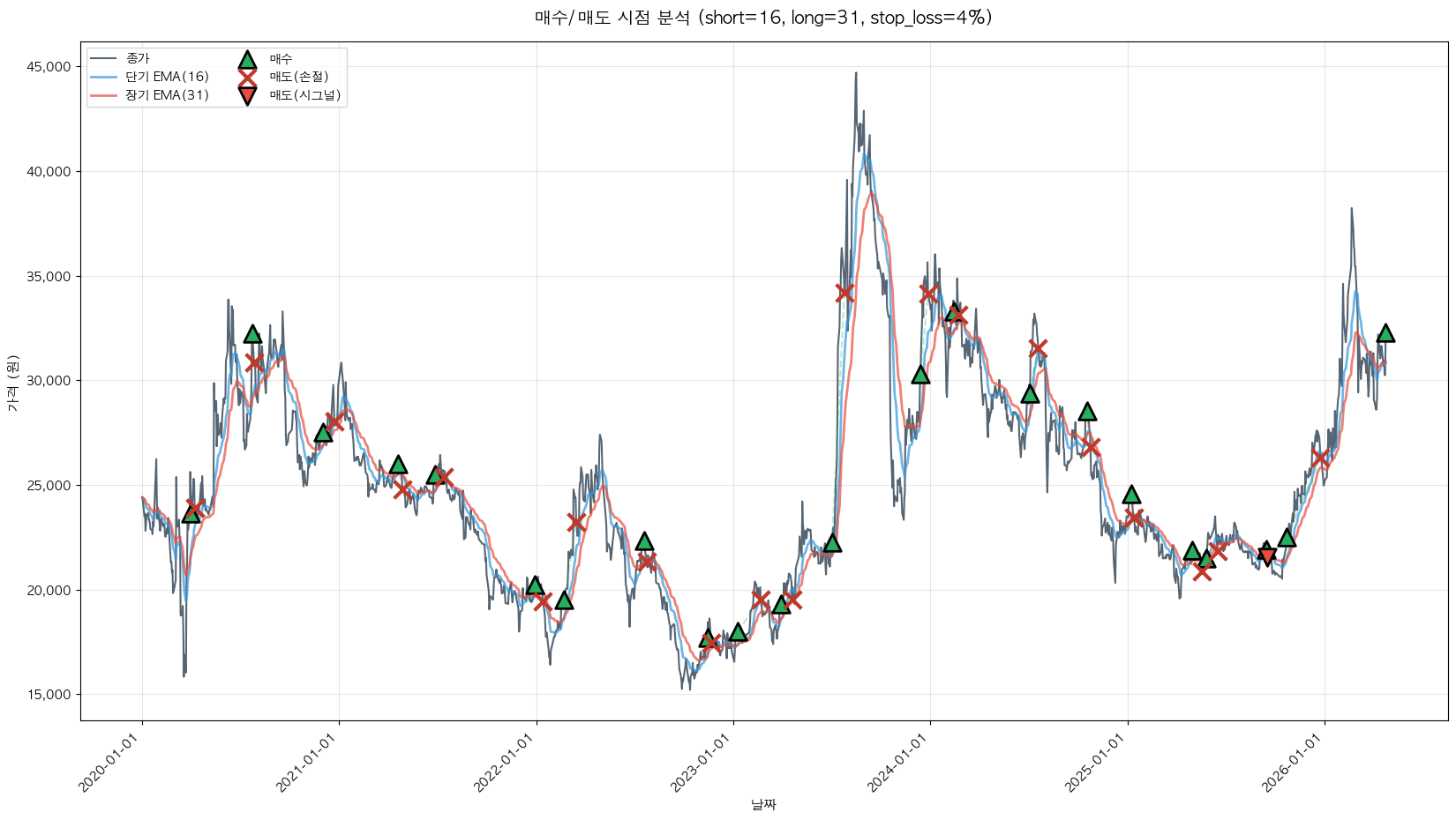백테스팅 중... (short=16, long=31, stop_loss=4%)