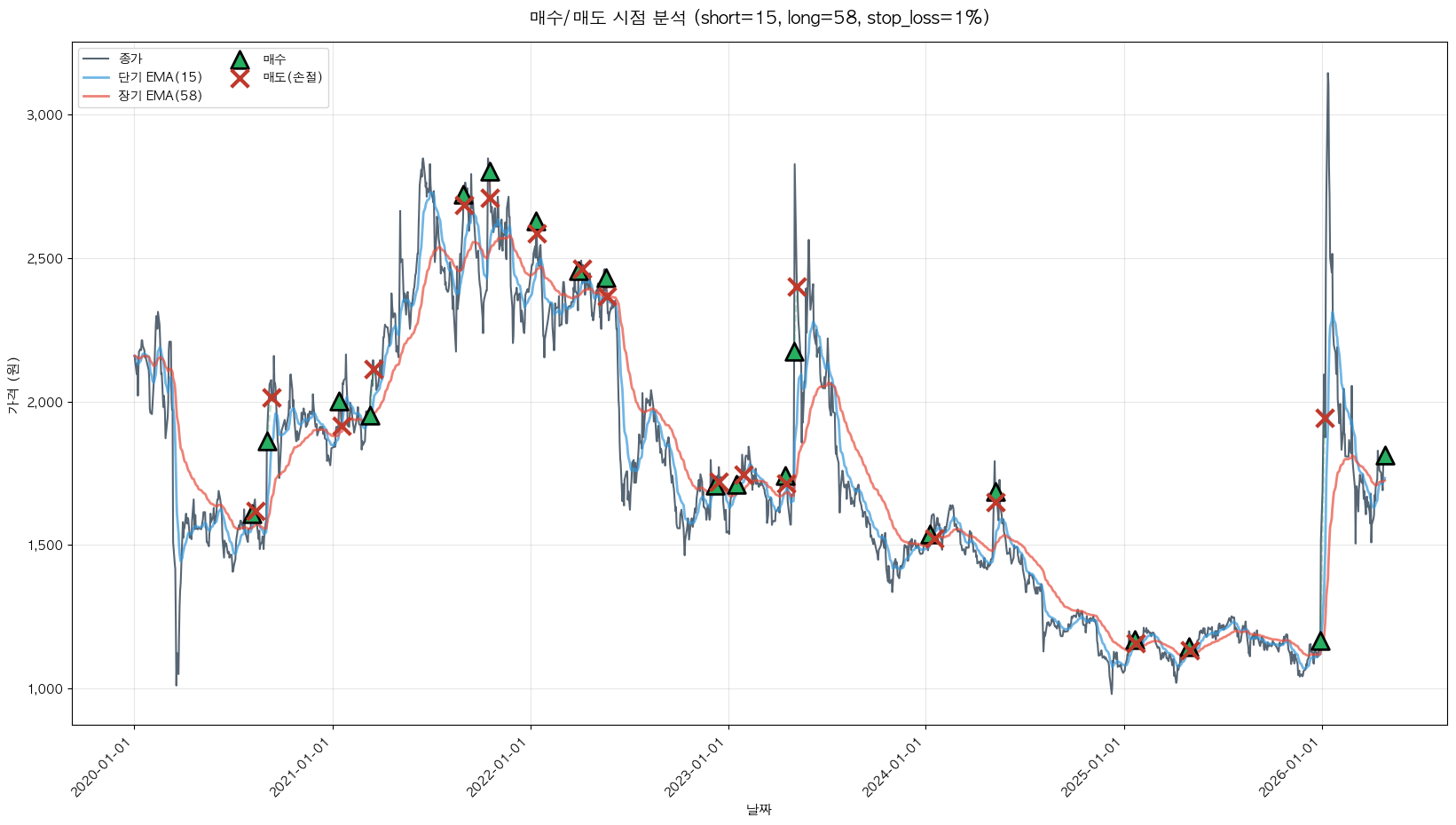 최적 파라미터: 단기=15, 장기=58, 손절=1%