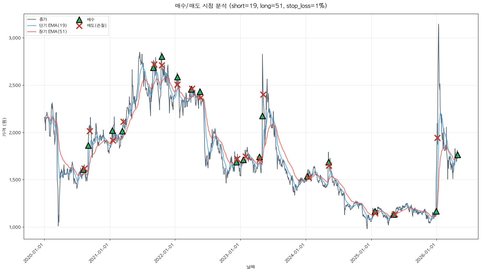 백테스팅 중... (short=19, long=51, stop_loss=1%)