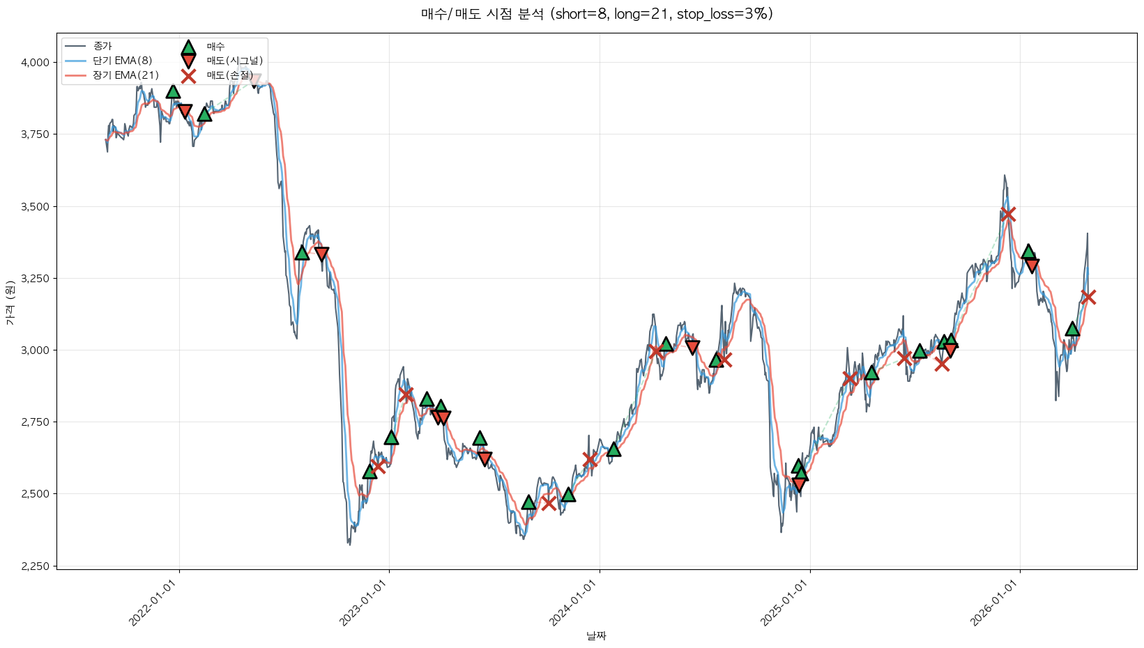 백테스팅 중... (short=8, long=21, stop_loss=3%)