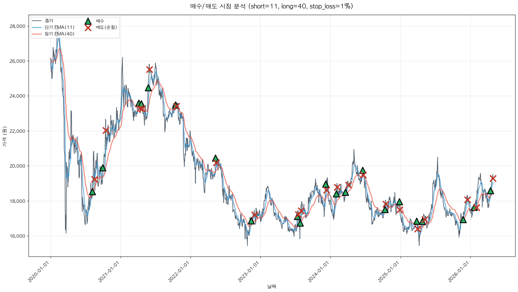 백테스팅 중... (short=11, long=40, stop_loss=1%)